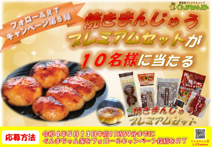 ●概要:「ぐんまちゃん家公式Twitter(@ginfo3)」をフォローし、キャンペーンの投稿をRTした方に、「焼きまんじゅうプレミアムセット」を抽選で10名様にプレゼント!
