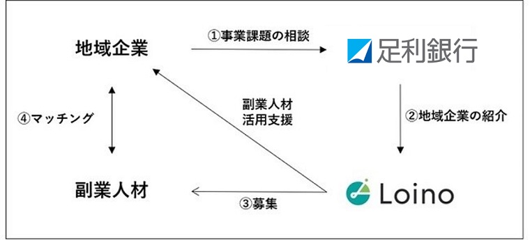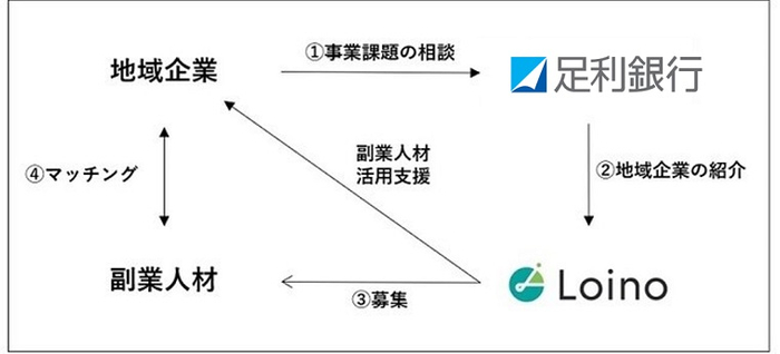 本業務提携において足利銀行は、取引先企業の人材ニーズを見極めたうえで適切な副業人材を「Loino」を通じて紹介し、「Loino」は、副業人材と企業とのマッチングとフォローアップを行います。
