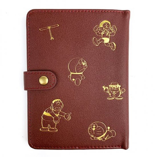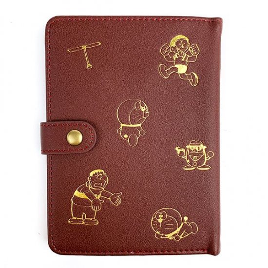 高級感のあるブラウンに、ドラえもんたちキャラクターが金押しされたマスク&ティッシュケースです。表面だけでなく裏面にも、ドラえもんやのび太、ドラミちゃんなどのキャラクターがデザインされています。