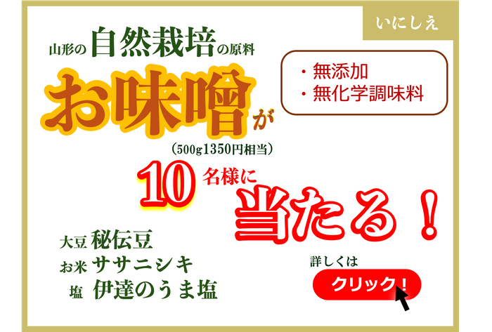 簡単なアンケートに答えていただいた方から抽選で10名様に(株)いにしえの味噌「いのいちばん」をプレゼントいたします。