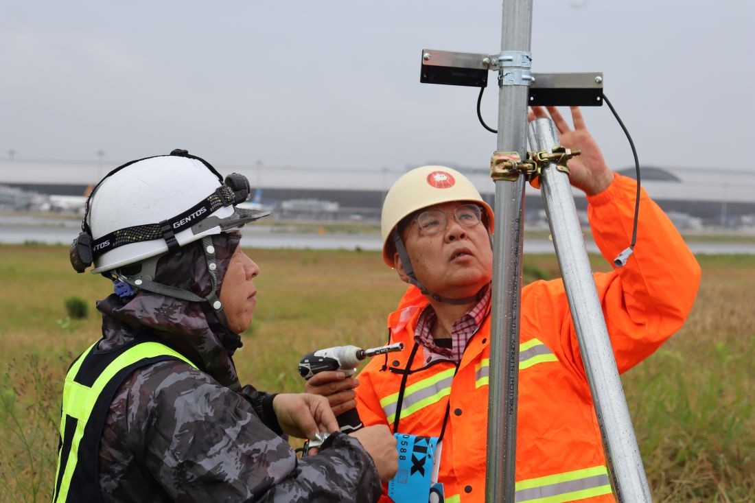 関西国際空港の滑走路わきにバードソニックを設置する辻特担教授(右)=2025年6月3日