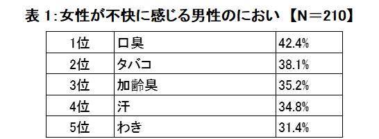 ◆女性が不快に感じている男性のにおいは、①口臭(42.4%)②タバコ(38.1%)③加齢臭(35.2%)。男性が不快に感じる女性のにおいは、①タバコ(17.6%)②香水(16.7%)③口臭(15.7%)。