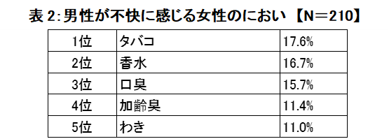 男性が不快に感じる女性のにおいは、 1位 タバコ 2位 香水 3位 口臭