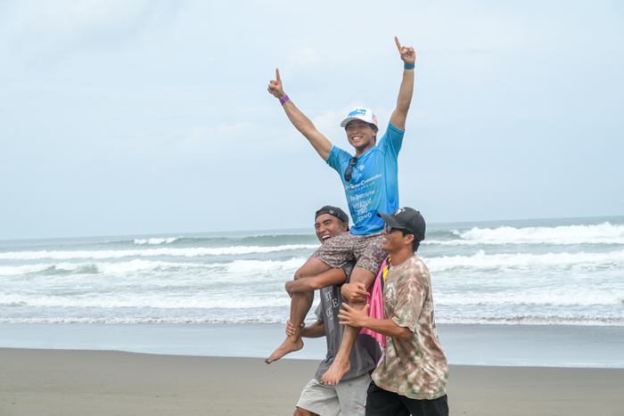 女子決勝は川瀬選手と松野選手の頂上決戦。川瀬選手は序盤から7.00をマークして主導権を握ると、残り5分にはダイナミックなターンを決めて7.67を記録。2本のグッドスコアを揃えて優位を築きました。松野選手も果敢に攻め、7.27をたたき出して食らいつき、ラストは残り10秒で渾身のワンターンに挑戦。ビーチ全体が固唾をのんで見守る中、スコアは6.47にとどまり逆転ならず。川瀬選手の勝利が確定した瞬間、両手を突き上げた川瀬選手に松野選手が歩み寄り、抱擁して健闘を称え合いました。川瀬選手は2023年12月の日向プロ以来となるQS2勝目を飾りました。
