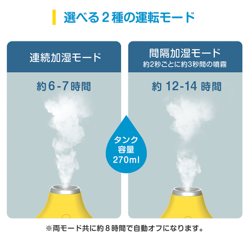 連続加湿モードと約2秒ごとに約3秒間噴霧する間隔加湿モードを搭載しているため、お部屋の状態や好みに合わせて加湿ができます。