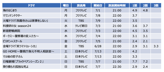 分析対象とした夏ドラマ12番組の1〜3話までの個人視聴率は、各話以下の通りとなっています。