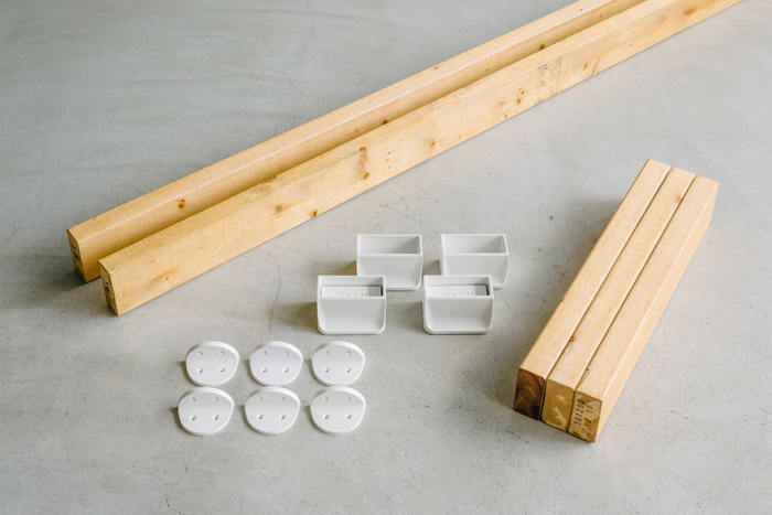 また初めは壁に壁を取り付けできるフレームと板の大掛かりなセットでしたが、ホームセンターでも手に入れやすい2×4材(ツーバイフォー)を使って柱を設置する方がより自由にDIYできるのではということで、今の形になりました。ばねの力でつっぱって柱を取り付けるディアウォールの誕生です!
