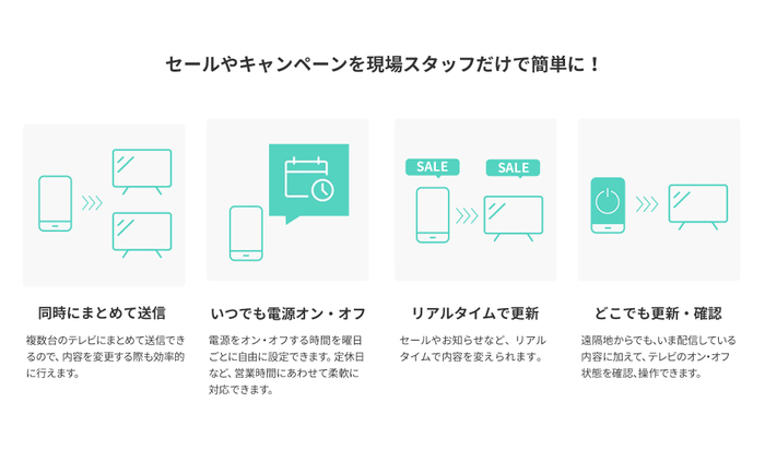 各売り場の商品の案内やフェア、催事などのイベント情報をスマホとクラウドを活用し遠隔操作で表示いたします。