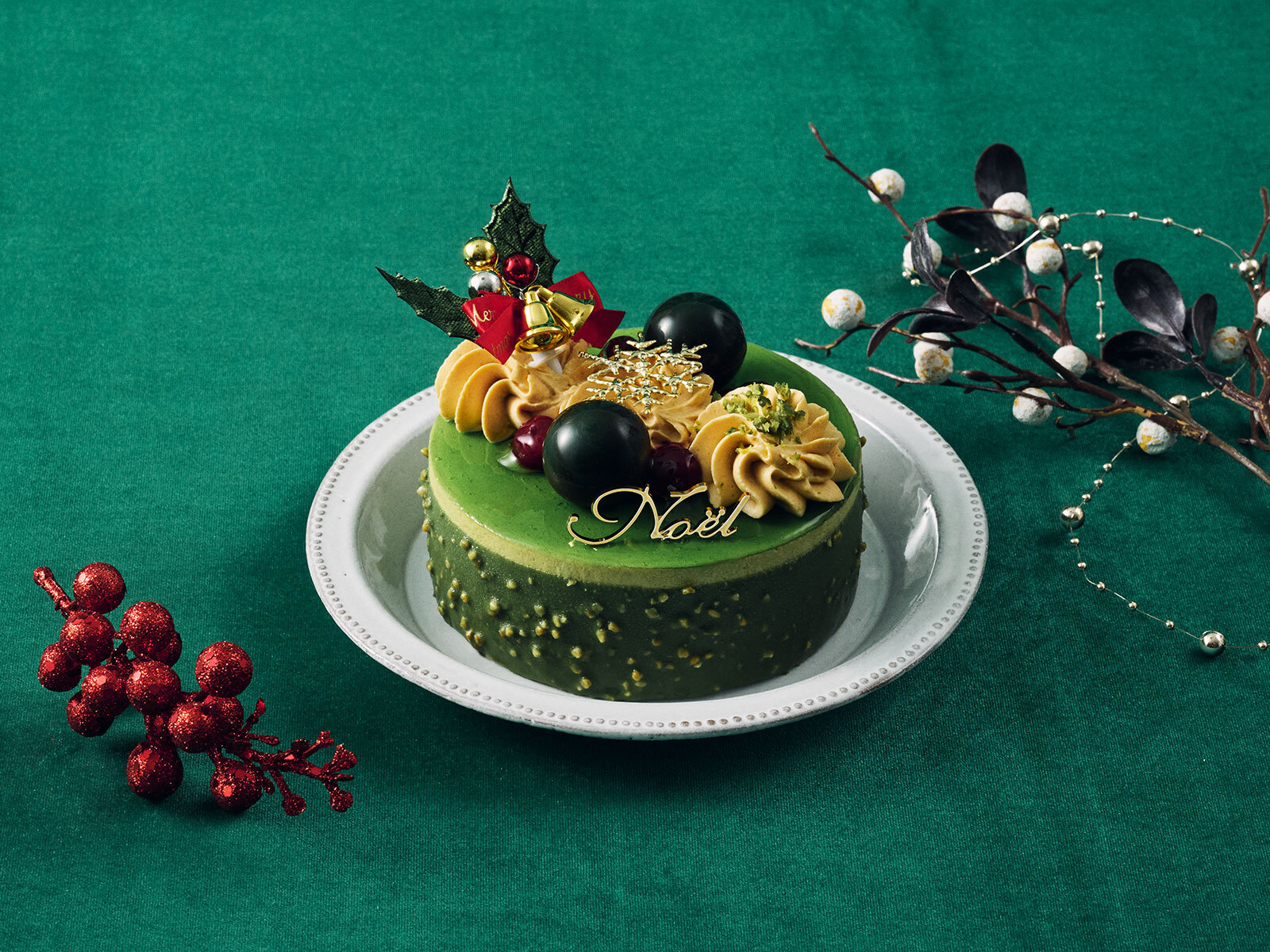 ●メープルシロップで仕上げた芳醇なピスタチオムースに、自家製キャラメルのほろ苦さ、グリオットチェリーの爽やかな酸味、ダックワーズショコラの重厚なコクを重ねました。ナッツ、果実、カカオの風味が繊細に調和し、贅沢な聖夜のひとときを演出します。