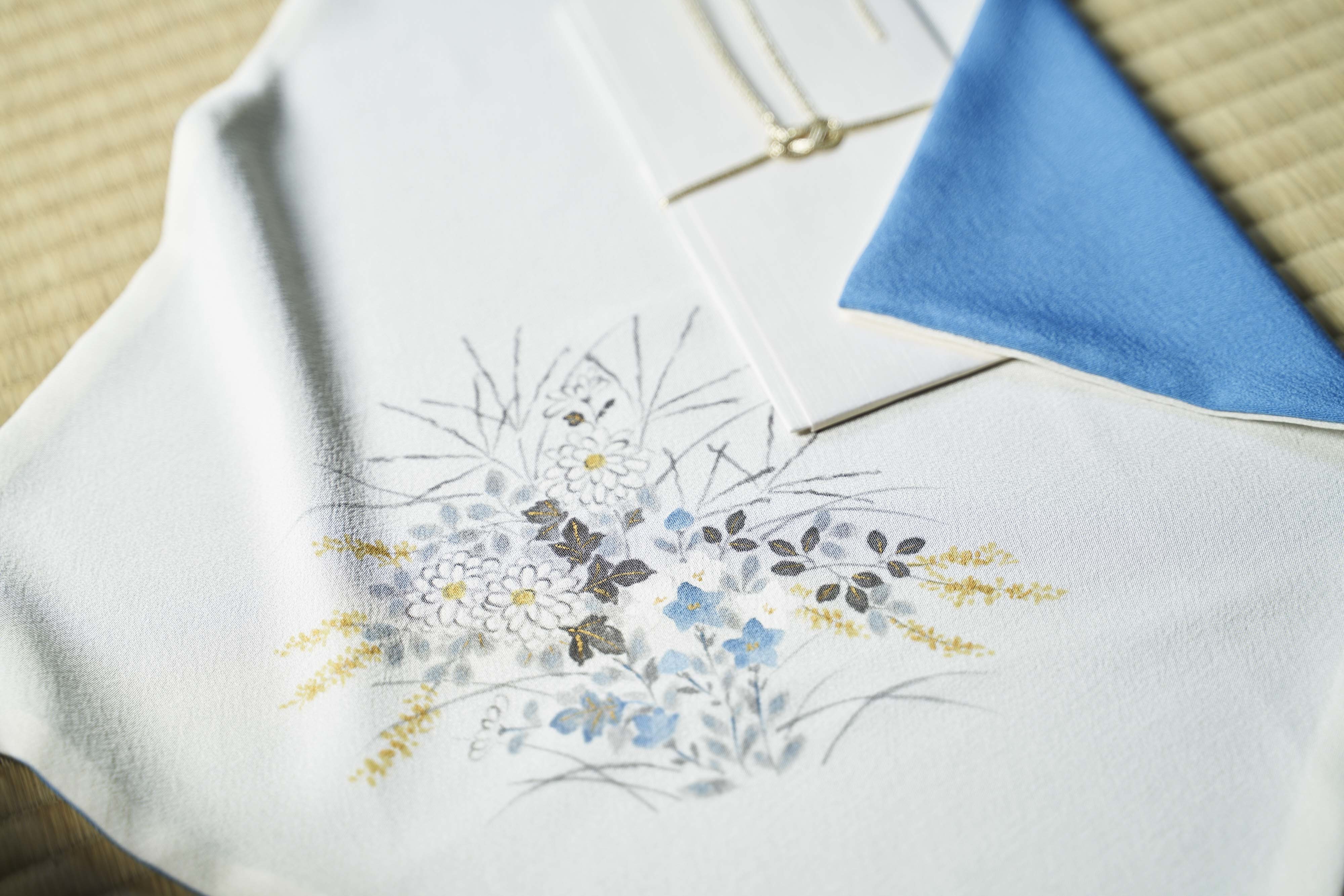 〈冬木小袖〉とは、尾形光琳が約300年前に、みずから筆をとって秋草の模様を描いたきものです。京都から江戸に出た光琳が滞在した深川の材木問屋、冬木家の夫人のために描いたといわれ、〈冬木小袖〉と呼ばれています。こうした「描絵小袖」は、まさに一点ものの特注品、当時裕福な女性の間で流行していました。