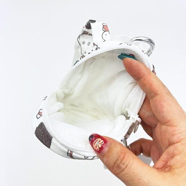 サイズは13cm×10cm×3cmで、小さな化粧品や鍵などの収納にはピッタリなサイズ感。カラビナ付きなので、トートバッグやいつものリュックにカチッと装着しやすくなっています。