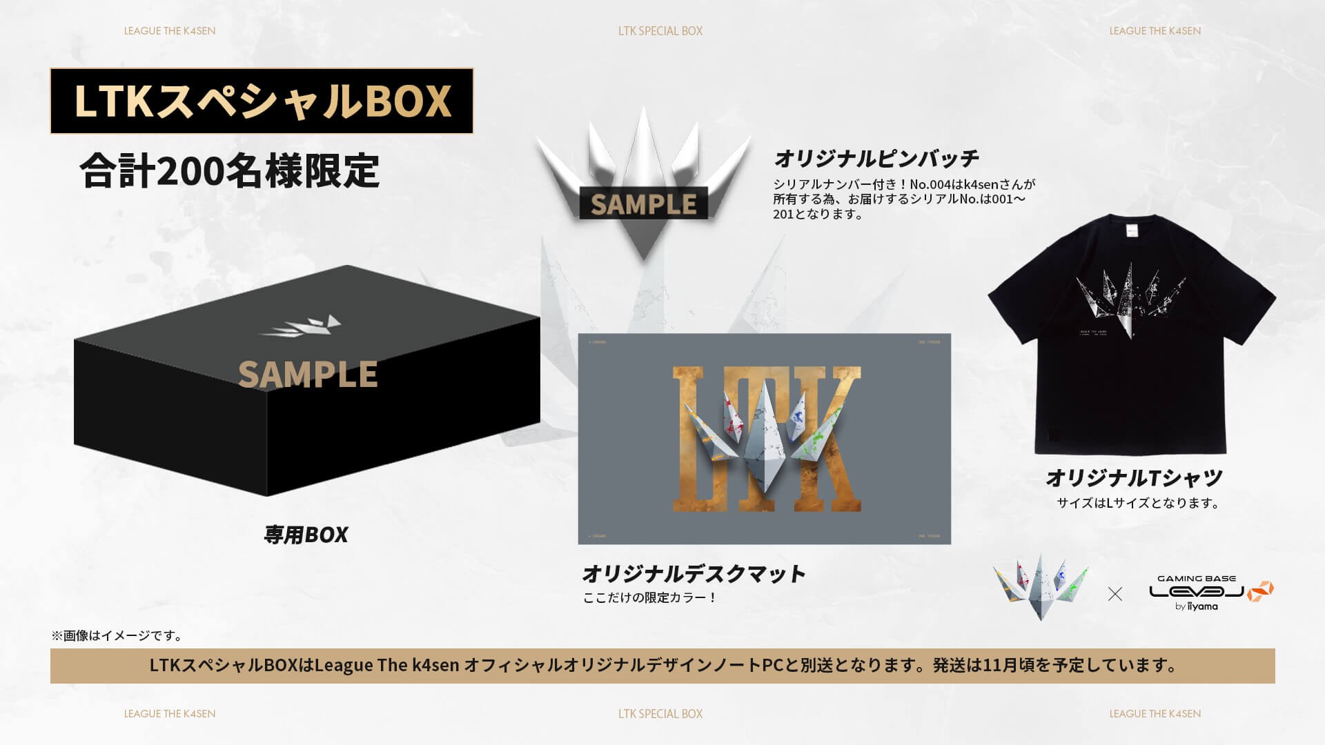 ・LTKスペシャルBOXはLeague The k4sen オフィシャルオリジナルデザイン ノートPCと別送となります。納期は11月頃を予定しております。