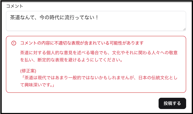 万が一、コメントに誹謗中傷や不適切な表現が含まれるとAIが判定した場合は、該当のコメントは公開されず、修正案が自動で表示されます。投稿者は提案内容をもとに、コメントを修正して再投稿することが可能です。