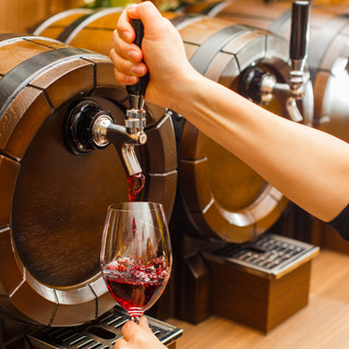 お店に並んでいる樽生ワインは葡萄の収穫と醸造を現地でおこなった後、直送されてきたものです。飲むごとにサーバーから1杯ずつ注がれるため、樽詰めしたときの豊かな香りをそのまま堪能できますよ。