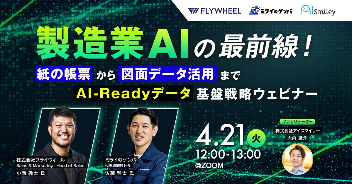 国内最大級のAIポータルメディア「AIsmiley」を運営する株式会社アイスマイリー(東京都渋谷区、代表取締役:板羽晃司)は、2026年4月21日(火)12時から製造業向けAIウェビナーを開催します。