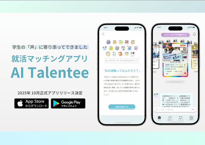 当社は富山発のスタートアップとして、就活をしている学生、新卒採用をしたい企業に対して「新しい出会い方」を提案しています。主力サービスのAIタレンティーは、ネームバリュー・給与・職種などの“条件”をあえて排し、価値観や適性を軸に学生と企業をマッチングする“価値観重視型”のキャリア支援サービスです。