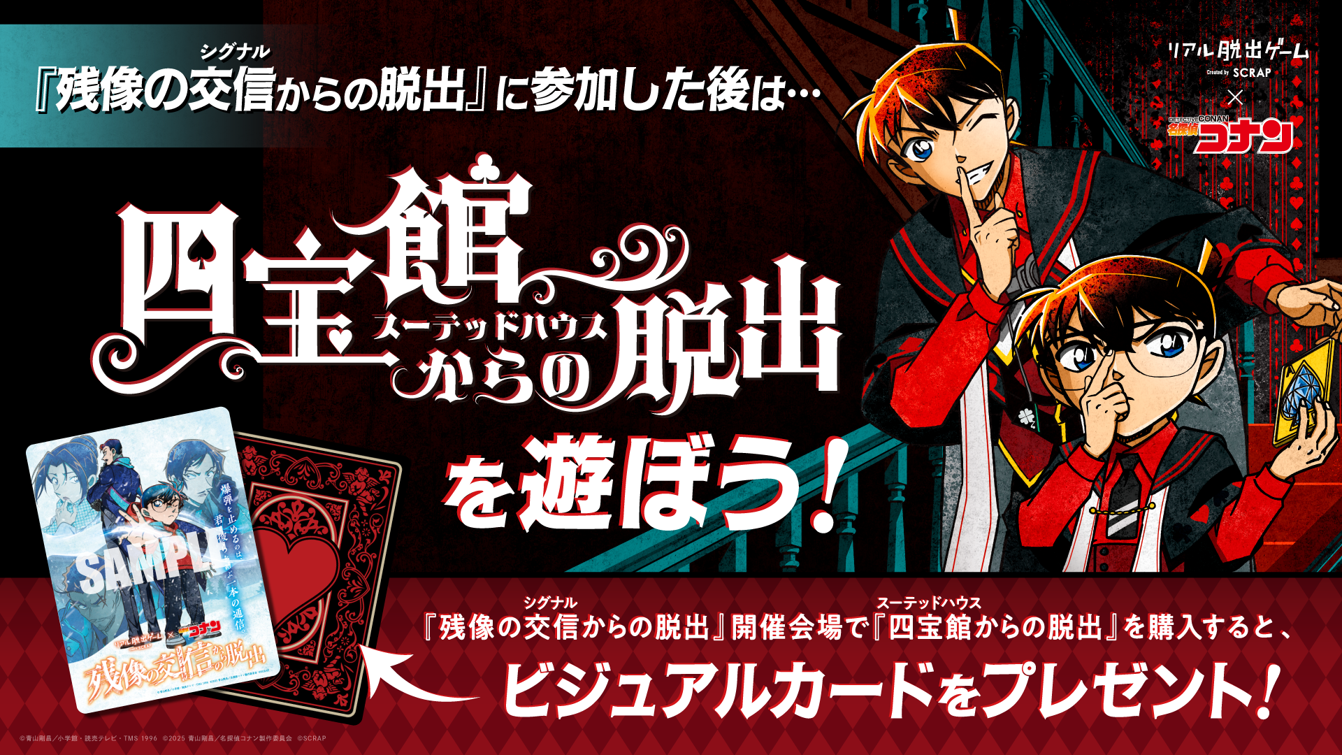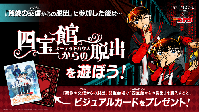 『残像の交信からの脱出』開催会場で、お家で遊べるコナン脱出の最新作『四宝館からの脱出』をご購入いただいた方に、オリジナルビジュアルカードをプレゼントいたします。