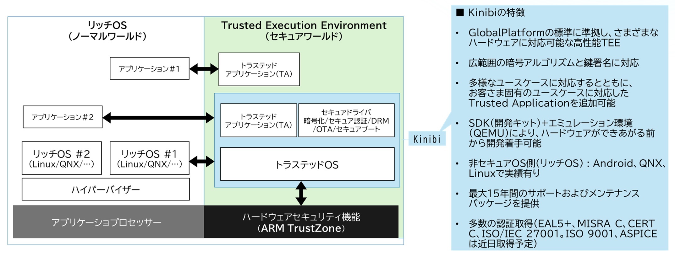 「Kinibi」はGlobalPlatform*1により標準化されたTEE*2に準拠し、通常のリッチOSが動作するノーマルワールドから分離したセキュアワールドでセキュリティ機能が実行され、デバイス全体のセキュリティを強化します。