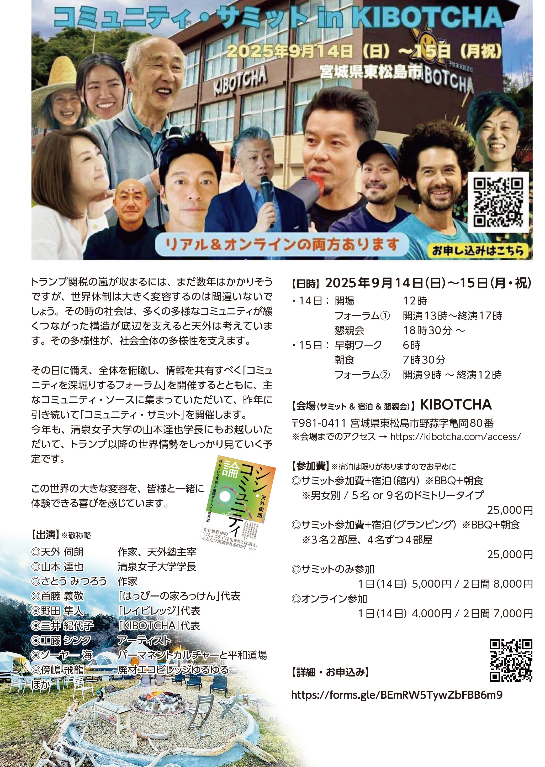 天外塾事務局(所在地:神奈川県茅ヶ崎市、代表:岡)は、天外伺朗の新刊、『コミュニティ』(VOICE)の出版を記念し、2025年9月14日(日)~9月15日(月・祝)にコミュニティサミットを宮城県東松島市で開催いたします。