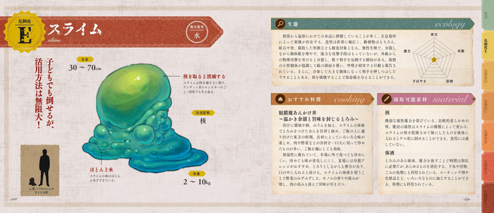皮剥ぎや部位の切り離しなど本格的な工程をイラストで解説し、得られる素材や危険度もわかりやすく紹介。さらに、コカトリスやサハギンなどの肉を使った“おいしい食べ方”まで収録。