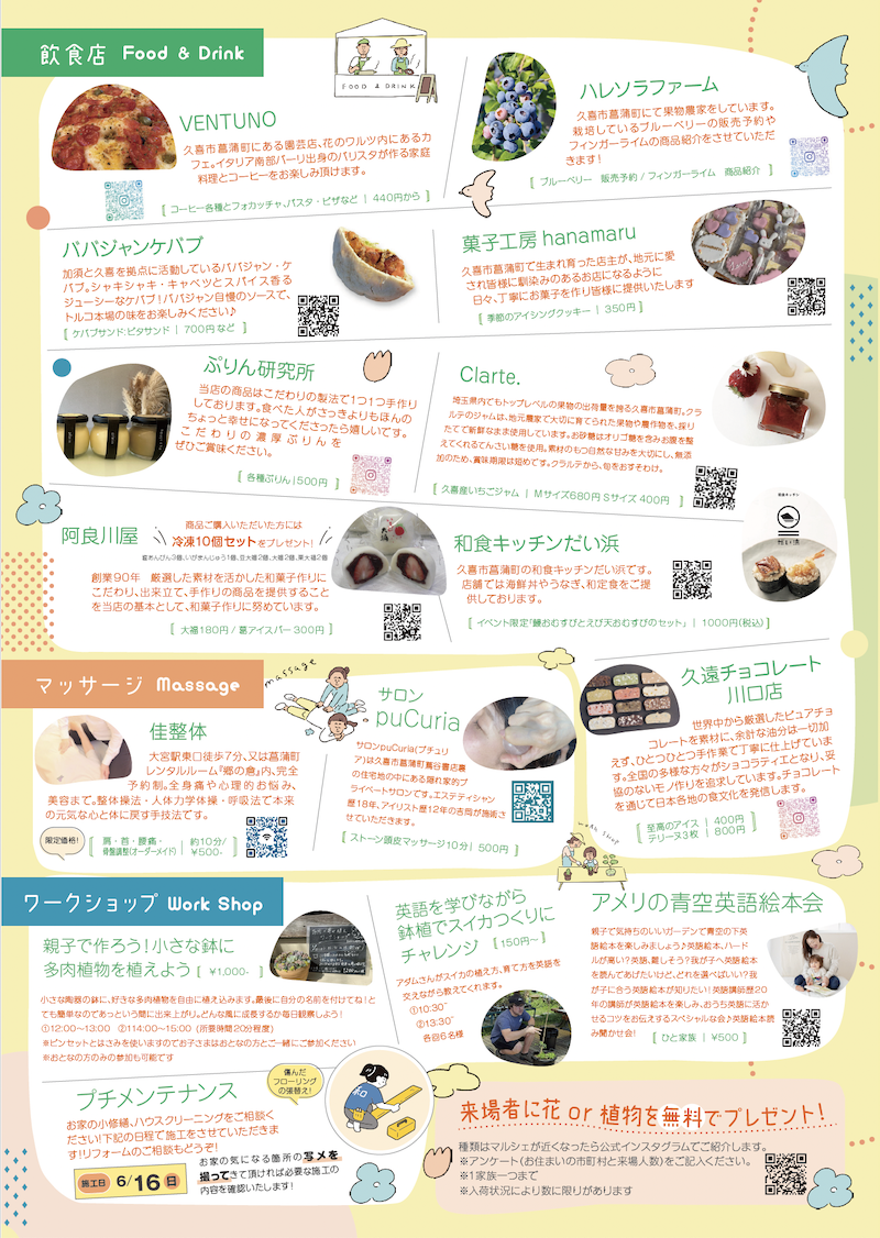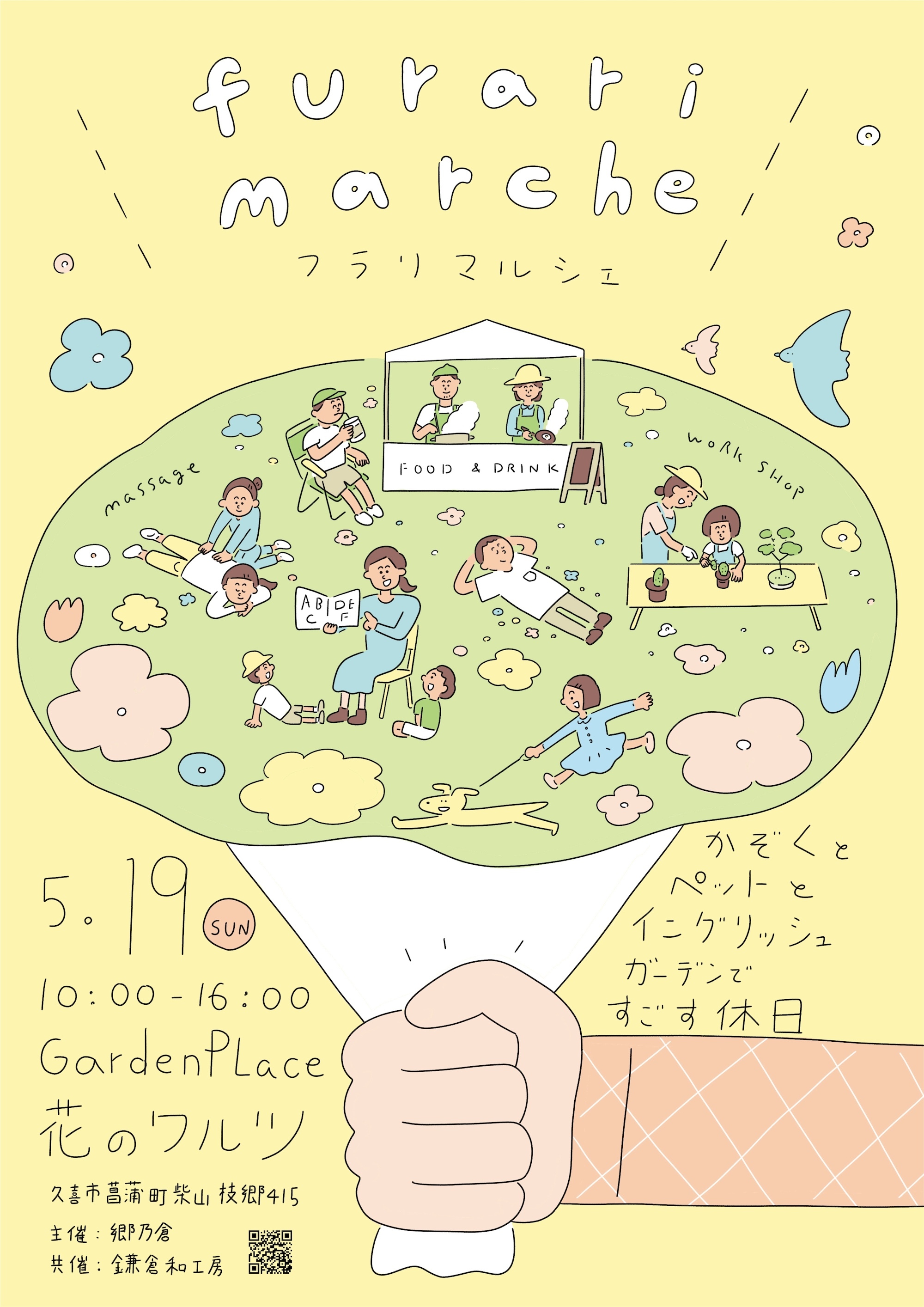 郷乃倉(埼玉県久喜市菖蒲町569-1、代表:平澤 栄樹)は5月19日(日)に久喜市菖蒲町周辺地域の飲食店、リラクゼーション、ワークショップが集まるイベント『フラリマルシェ』を開催します。この度、出展者が決定いたしましたのでお知らせいたします。