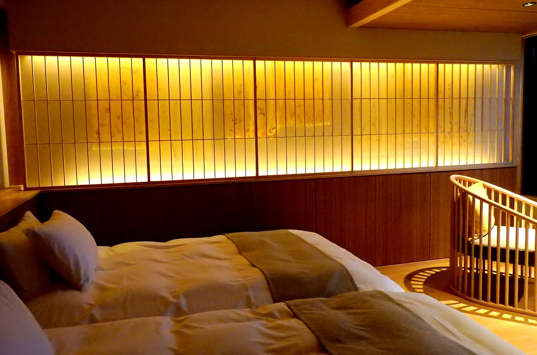 エグゼクティブフロア「黄昏(こうこん)」と「東雲(しののめ)」が8・9階に誕生。いずれの部屋もオーシャンビューのベッドタイプの客室として整備。各フロアに1室ずつ設けたデラックスコーナールームは、出船入船が行き来する開けた海、フェリーが停泊する西郷港、港周辺の風情ある街並みの3面パノラマビューが広がり、海の風景を楽しめる半露天風呂も設えました。また、隠岐の島の情景や四季の移ろいを感じていただけるよう、客室名も隠岐の島の自然からインスパイアされた名称としています。フロアには隠岐の黒松ネームプレートを設置、客室には隠岐諸島:西ノ島の土で美しく染め上げた綿のストールや、島後の大工手作りの茶器トレイなどを設え、隠岐の島を感じる宿泊体験をご提供いたします。