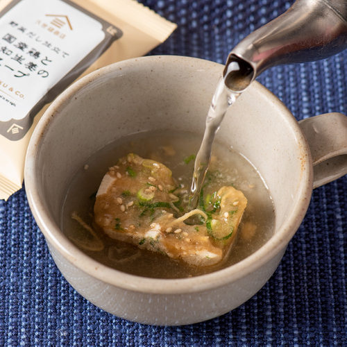 生姜の辛みと香りがアクセント!「野菜だし仕立て 国産鶏と高知生姜のスープ」