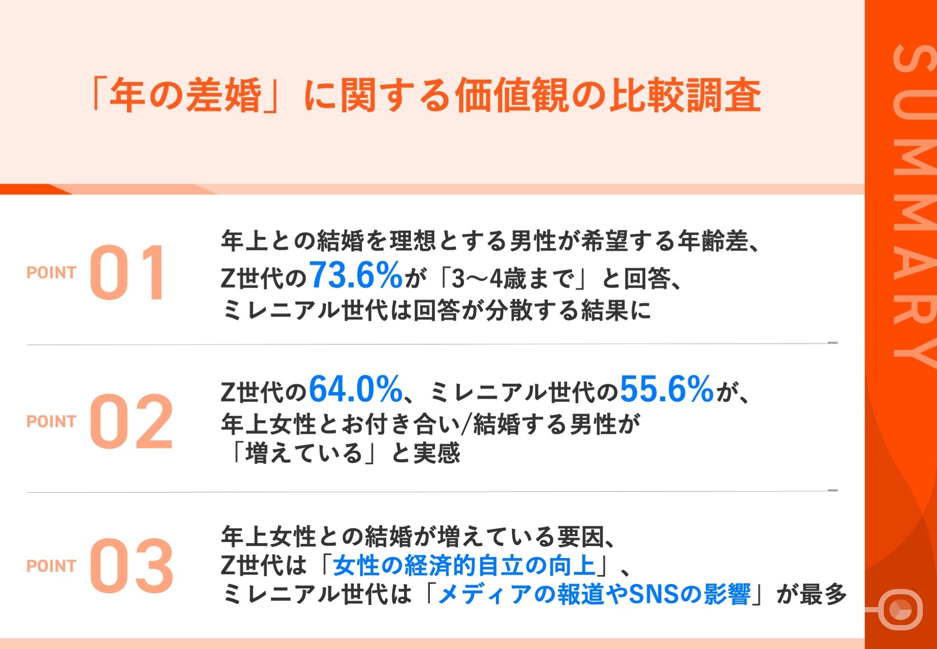 ・01|年上との結婚を理想とする男性が希望する年齢差、Z世代の73.6%が「3~4歳まで」と回答、ミレニアル世代は回答が分散する結果に