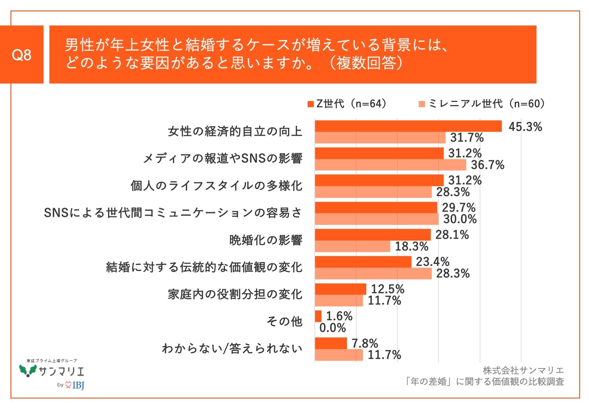 Q6で「非常に感じる」「やや感じる」と回答した方に、「Q8.男性が年上女性と結婚するケースが増えている背景には、どのような要因があると思いますか。(複数回答)」と質問したところ、将来的に結婚を希望しているZ世代男性(n=64)は「女性の経済的自立の向上」が45.3%、「メディアの報道やSNSの影響」が31.2%、「個人のライフスタイルの多様化」が31.2%、既婚のミレニアル世代男性(n=60)は「メディアの報道やSNSの影響」が36.7%、「女性の経済的自立の向上」が31.7%という回答となりました。