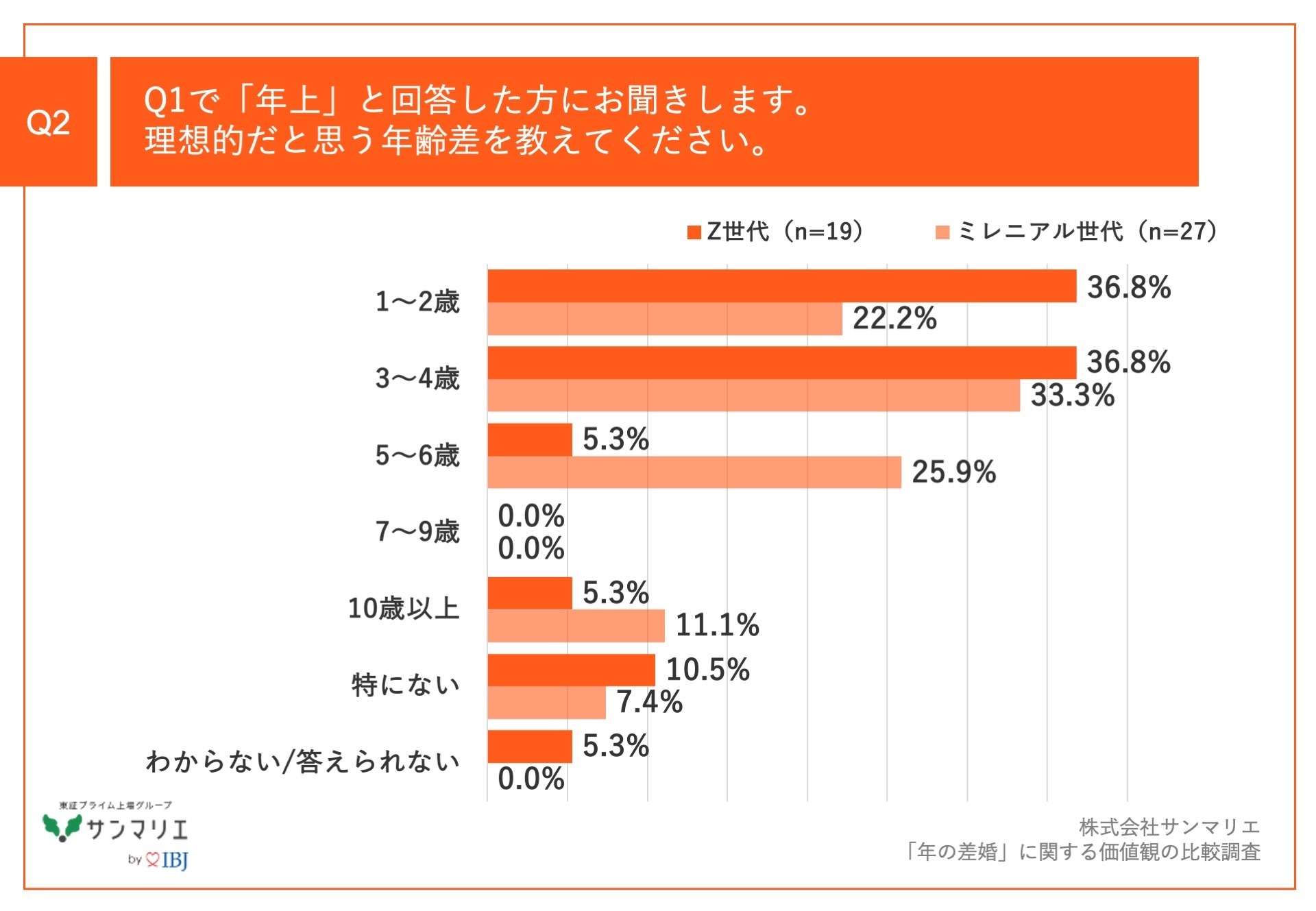 Q1で「年上」と回答した方に、「Q2.理想的だと思う年齢差を教えてください。」と質問したところ、将来的に結婚を希望しているZ世代男性(n=19)は「1~2歳」が36.8%、「3~4歳」が36.8%、既婚のミレニアル世代男性(n=27)は「3~4歳」が33.3%、「5~6歳」が25.9%という回答となりました。