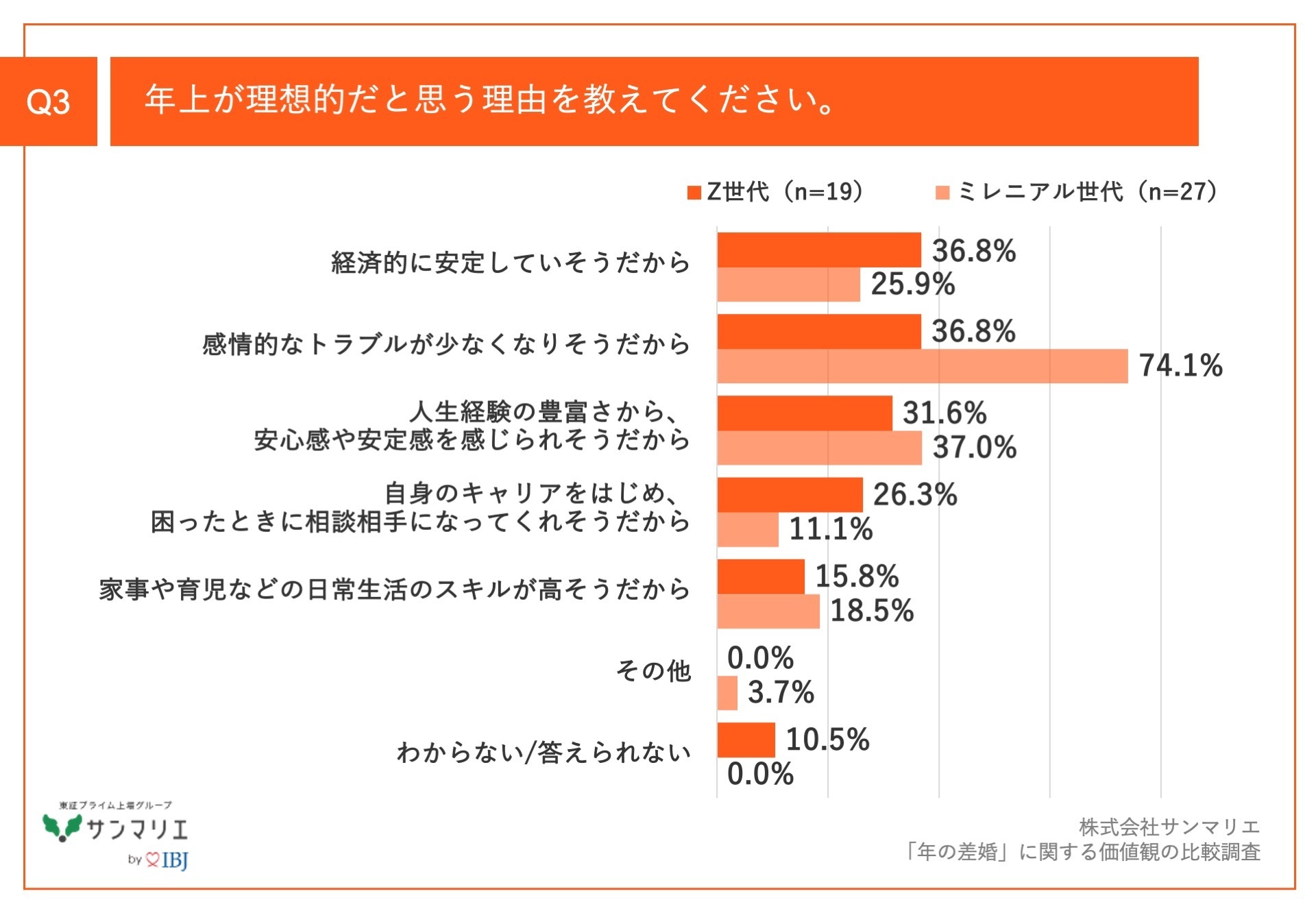 Q1で「年上」と回答した方に、「Q3.年上が理想的だと思う理由を教えてください。」と質問したところ、将来的に結婚を希望しているZ世代男性(n=19)は「経済的に安定していそうだから」が36.8%、「感情的なトラブルが少なくなりそうだから」が36.8%、既婚のミレニアル世代男性(n=27)は「感情的なトラブルが少なくなりそうだから」が74.1%、「人生経験の豊富さから、安心感や安定感を感じられそうだから」が37.0%という回答となりました。