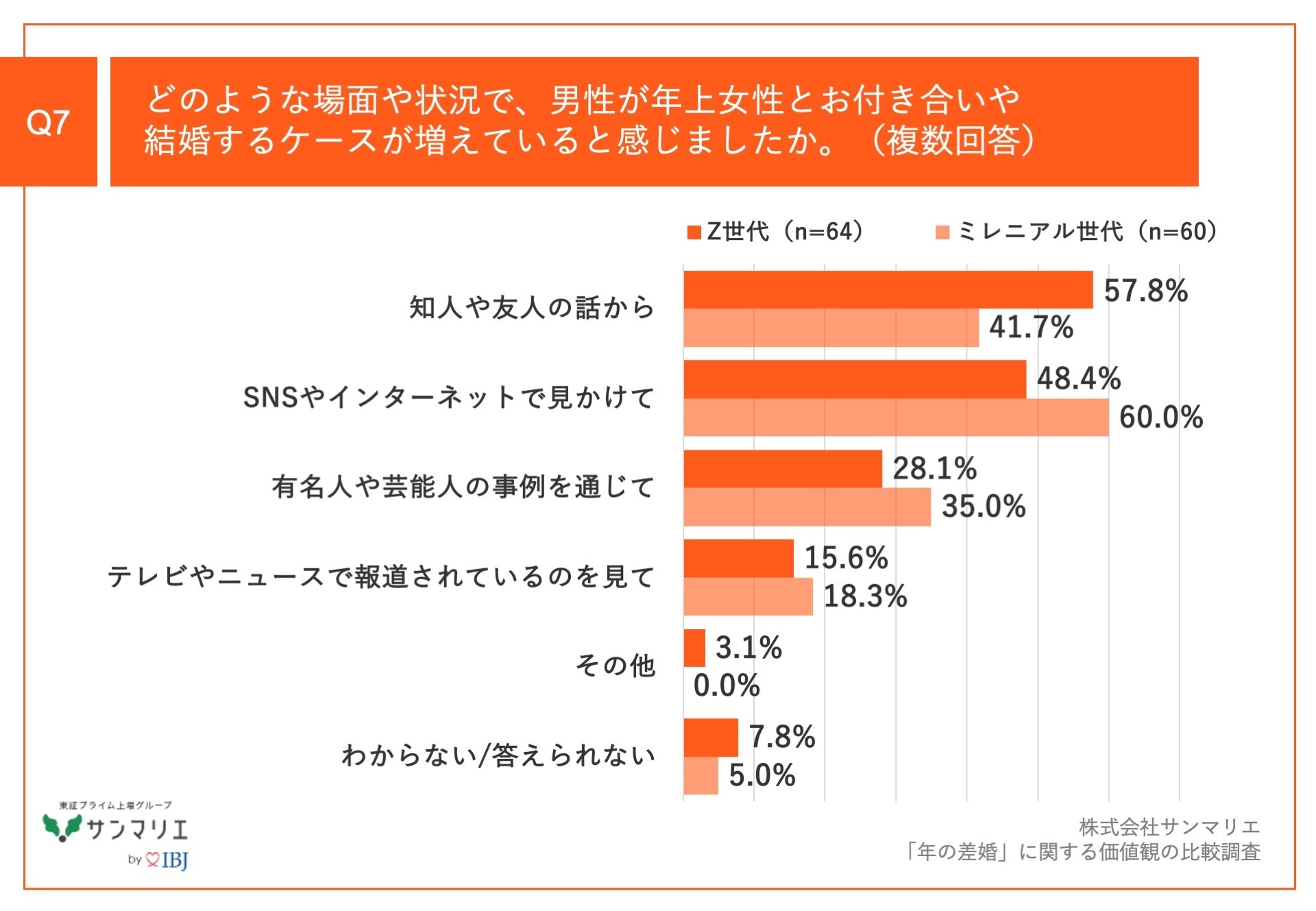 Q6で「非常に感じる」「やや感じる」と回答した方に、「Q7.どのような場面や状況で、男性が年上女性とお付き合いや結婚するケースが増えていると感じましたか。(複数回答)」と質問したところ、将来的に結婚を希望しているZ世代男性(n=64)は「知人や友人の話から」が57.8%、「SNSやインターネットで見かけて」が48.4%、既婚のミレニアル世代男性(n=60)は「SNSやインターネットで見かけて」が60.0%、「知人や友人の話から」が41.7%という回答となりました。
