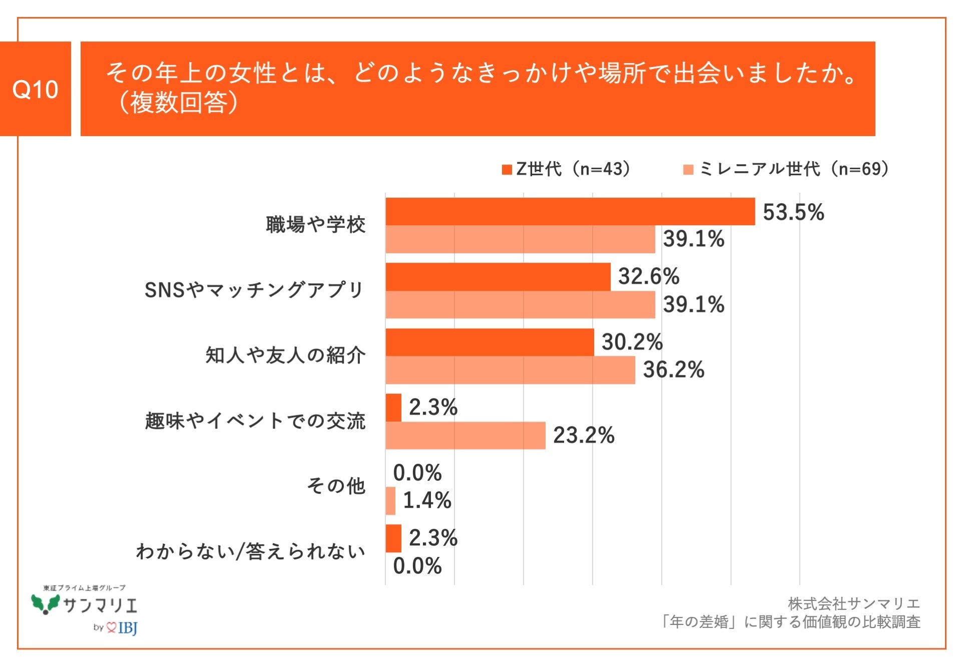 Q9で「ある」と回答した方に、「Q10.その年上の女性とは、どのようなきっかけや場所で出会いましたか。(複数回答)」と質問したところ、将来的に結婚を希望しているZ世代男性(n=43)は「職場や学校」が53.5%、「SNSやマッチングアプリ」が32.6%、既婚のミレニアル世代男性(n=69)は「SNSやマッチングアプリ」が39.1%、「職場や学校」が39.1%という回答となりました。