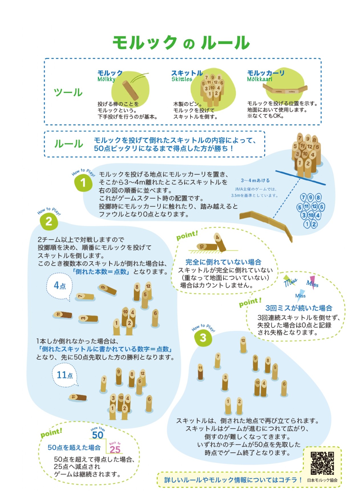 モルックは、木製の棒(モルック)を投げて数字が書かれたピン(スキットル)を倒し、ちょうど50点を目指すシンプルなルールのスポーツです。特別な道具や服装の準備は不要で、初めての方やお子さまでも気軽に参加できます。