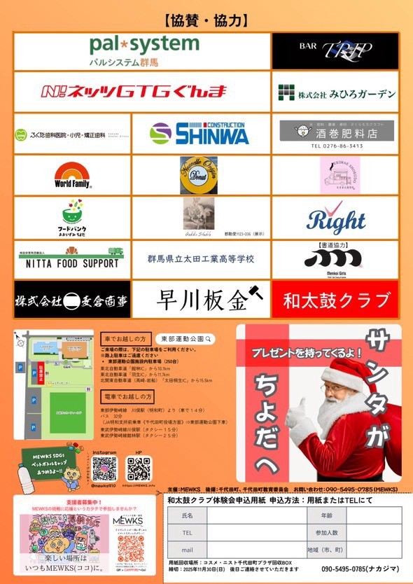 2025年12月14日(日)、群馬県邑楽郡千代田町の「東部運動公園」にて、地域の絆と学びをテーマにした体験型イベント「MEWKS産業祭〜クリスマスフェスタ〜」を開催いたします。防災やSDGs、アップサイクルなどを「楽しみながら学べる」コンテンツとして企画し、子どもから大人まで幅広くご参加いただける内容となっております。