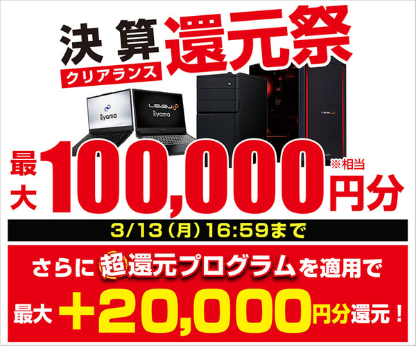 パソコン工房WEB会員またはビジネスご優待会員にご登録の上、期間中に指定金額以上のiiyama PCをお買い上げいただいた方に、最大10万円分相当のWEBポイントを還元いたします。
