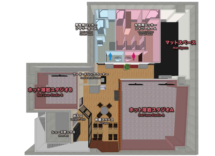 天然の溶岩を使ったホットスタジオで、ホットヨガとマットスペースの他、パーソナルで利用できる少人数用の溶岩室も備えた高級感のある会員制フィットネスとなっております。