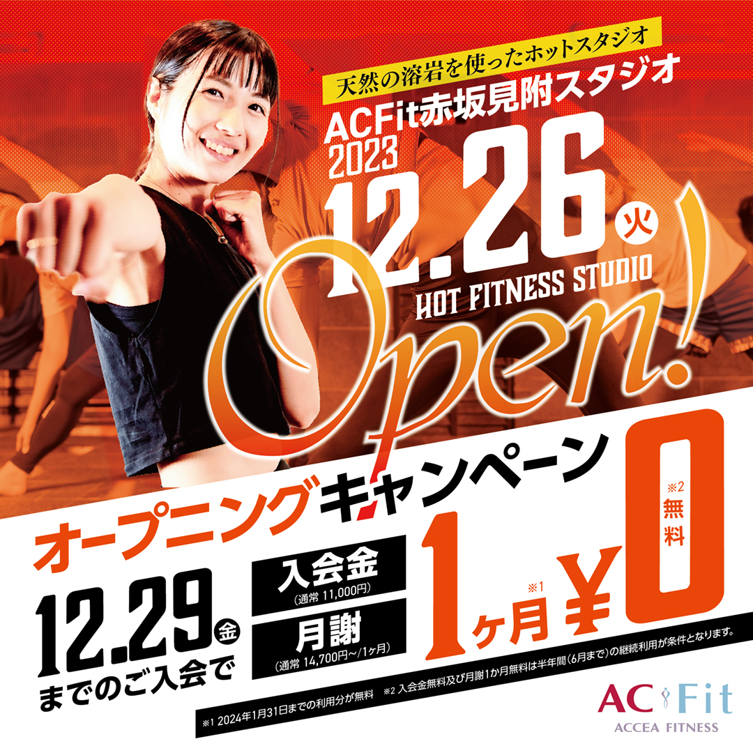ACFit赤坂見附スタジオのオープンを記念して、12/29(金)までの3日間限定でオープニングキャンペーンを開催致します。