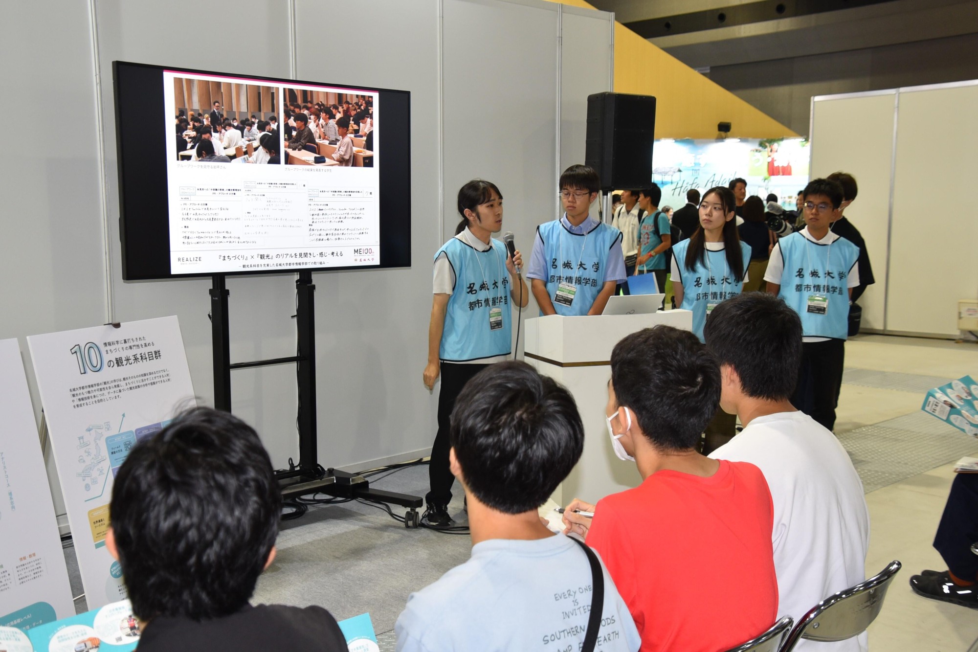 最終日の28日には特別コーナーに設けられたステージで30分間、4年生4人が「『まちづくり』×『観光』のリアルを見聞きし・感じ・考える-観光系科目を充実した、名城大学都市情報学部の取り組み-」と題して発表。講義や視察調査、アンケート調査、ナンバープレート調査などの狙いや内容などを紹介し、「実際に経験することで地域の課題をより具体的に知り、主体的に考えて取り組むきっかけになりました」と学びの意義を強調しました。