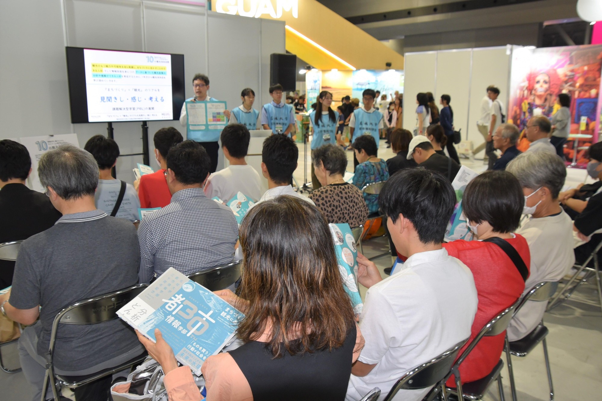 4日間の会期中、森准教授と観光系科目を受講した3、4年生計25人が交代でブースに待機。「フィールド調査の方法」や「世界遺産とツーリズム」など都市情報学部が展開する10の観光系科目群の概要や、森准教授のゼミが行っている氷見市でのナンバープレート調査の成果などが紹介されたリーフレットなどを配ったり、関心を示した来場者には都市情報学部全体の講義内容や学生生活の様子などを説明したりしました。