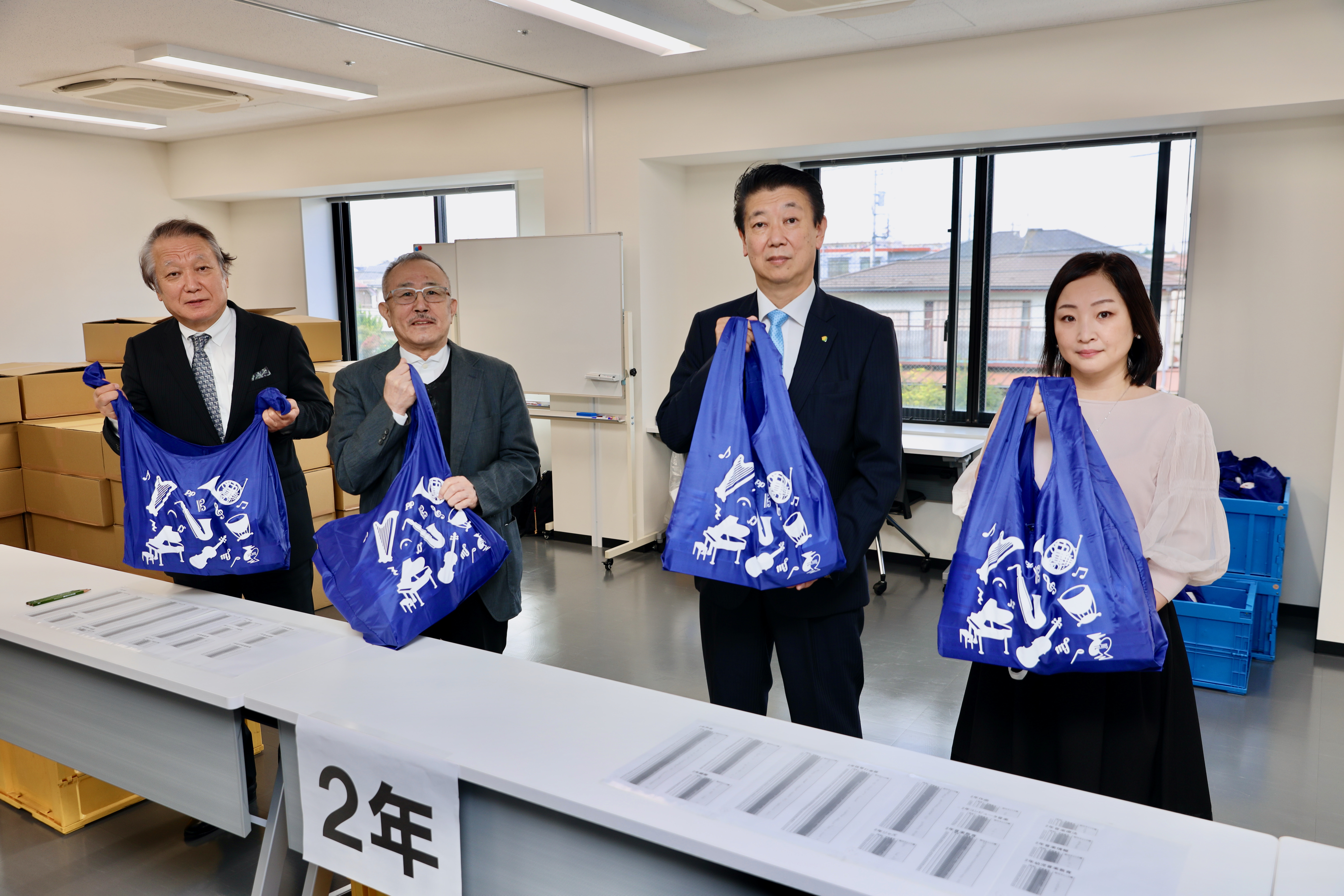 支援品は、カップラーメン、レトルト・カレーやパックご飯、栄養補助食品といった食料品、マスク、手指消毒用の除菌スプレー、ウェットシートの感染対策グッズを楽器をモチーフにしたオリジナルエコバッグに入れて学生一人ひとりに手渡しました。