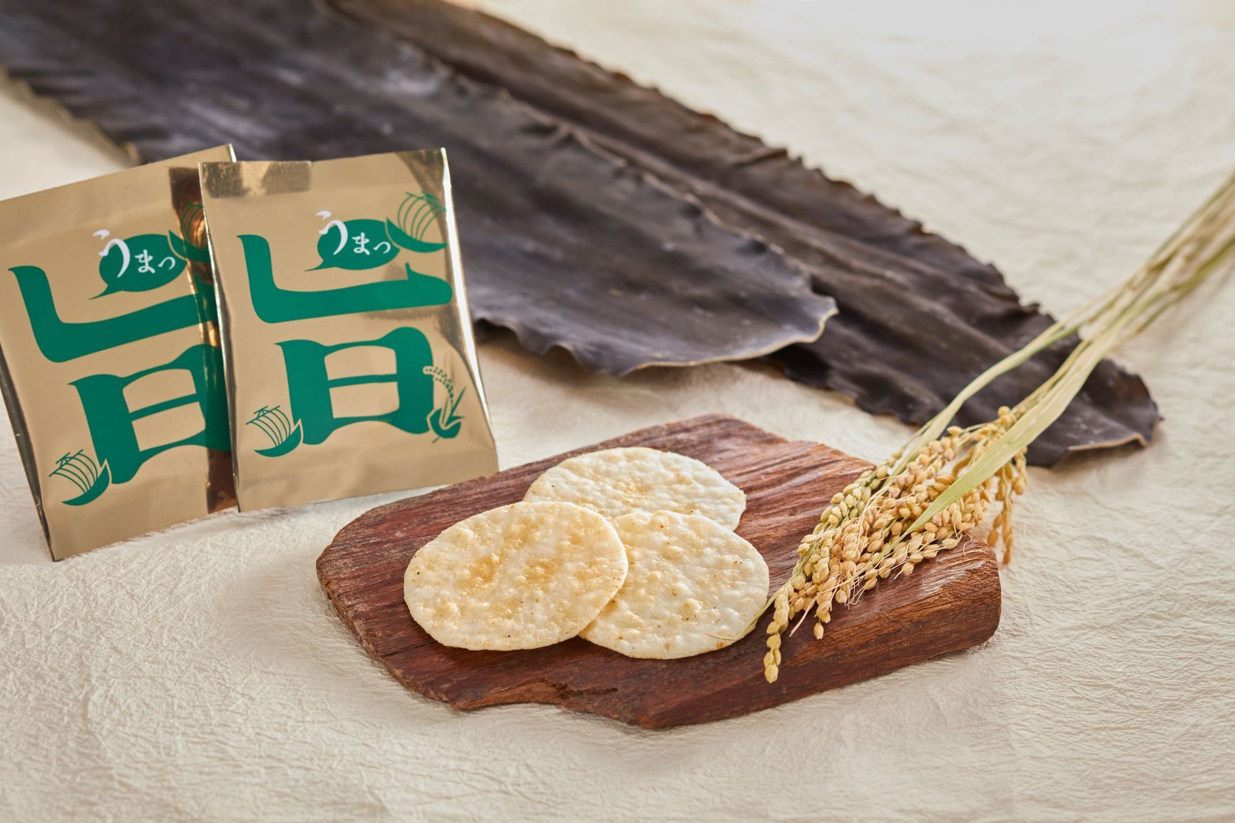 「天下の台所」大阪の小倉屋山本と米どころ富山の日の出屋製菓が“大阪の昆布”と“富山のお米”で作り上げた「うまみせんべい」です。