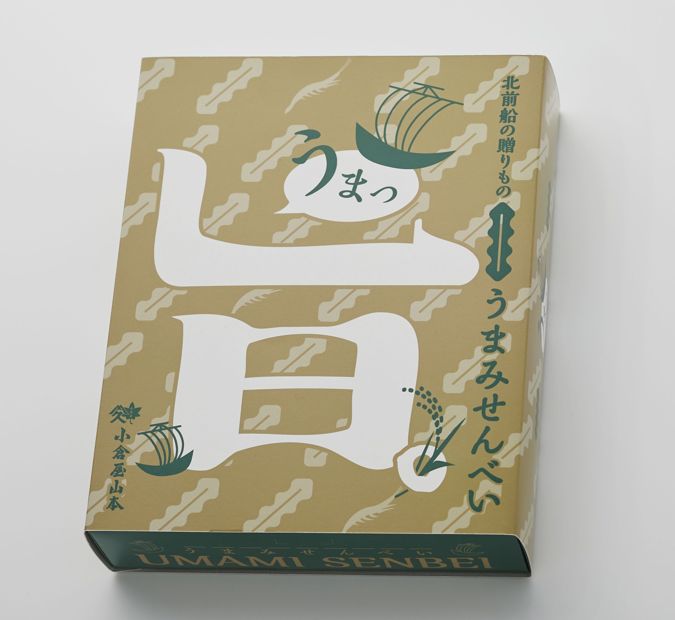 パッケージには大きく「旨」の文字を表現し、さりげなく昆布、しろえび、北前船のイラストを散りばめました。北前船の輝かしい功績をイメージした金色のデザインとあわせて、お土産に最適なパッケージに仕上げました。