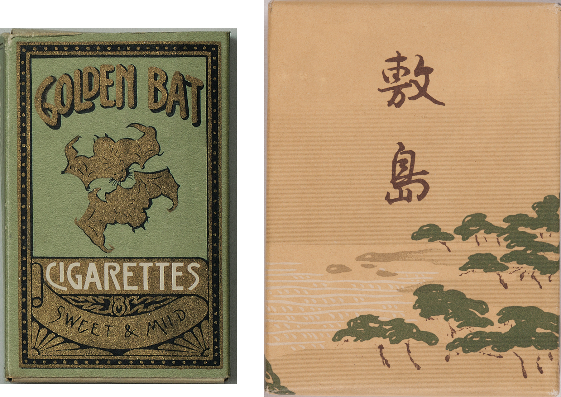 たばこは、日本には16世紀末に伝来し、広がっていきました。江戸時代から明治にかけては「細刻みたばこをきせるで吸う」という独自の喫煙風俗が主流でしたが、幕末から明治にかけて紙巻たばこがもたらされると、喫煙風俗も変化していきました。明治期においては都市部を中心に浸透していった紙巻たばこですが、大正時代末ごろになると、全国的に細刻みたばこの製造量を超え、主役になっていきました。龍之介も愛煙家として知られ、両切の紙巻たばこ「ゴールデンバット」を好んでいたようです。龍之介の作品にはさまざまなたばこが登場し、龍之介とたばこに関するエピソードも数多く残されています。ここでは、当館ならではの切り口として、龍之介とたばこ、たばこ文化の変化について紹介します。