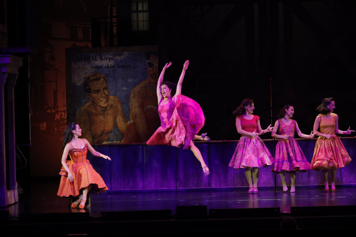 「America」では故郷プエルトリコより今住んでいるアメリカが一番!と、シャークス(プエルトリカン系)の女性たちがパワフルに歌い踊る。その華やかさといったら!6名の女性はオレンジとピンクのビビッドな色のドレスを着ており、とても洗練されていて美しい。それに合わせたのか、空の色もオレンジピンク。大きな広告の看板が掲げられているのが印象的だが、これは裕福な白人に向けた広告で当時の移民たちには手の届かないものだったとか。格差社会を暗喩した、このプロダクションならでは演出が効いている。