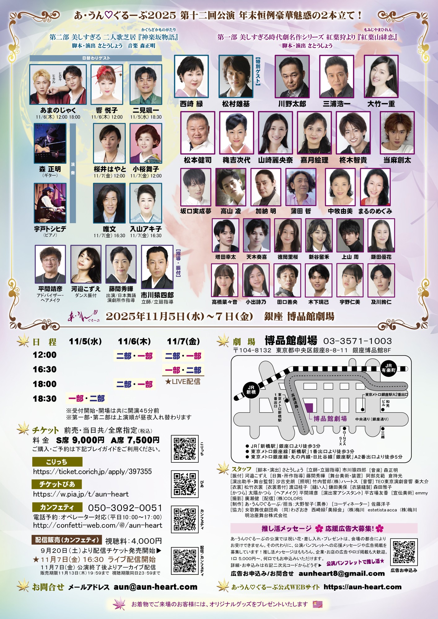あ・うん♡ぐるーぷ主催、あ・うん♡ぐるーぷ2025 第十二回公演 年末恒例豪華魅惑の2本立『紅葉山緋恋』『神楽坂物語』が2025年11月5日 (水) 〜 2025年11月7日 (金)に博品館劇場(東京都中央区銀座8-8-11)にて上演されます。