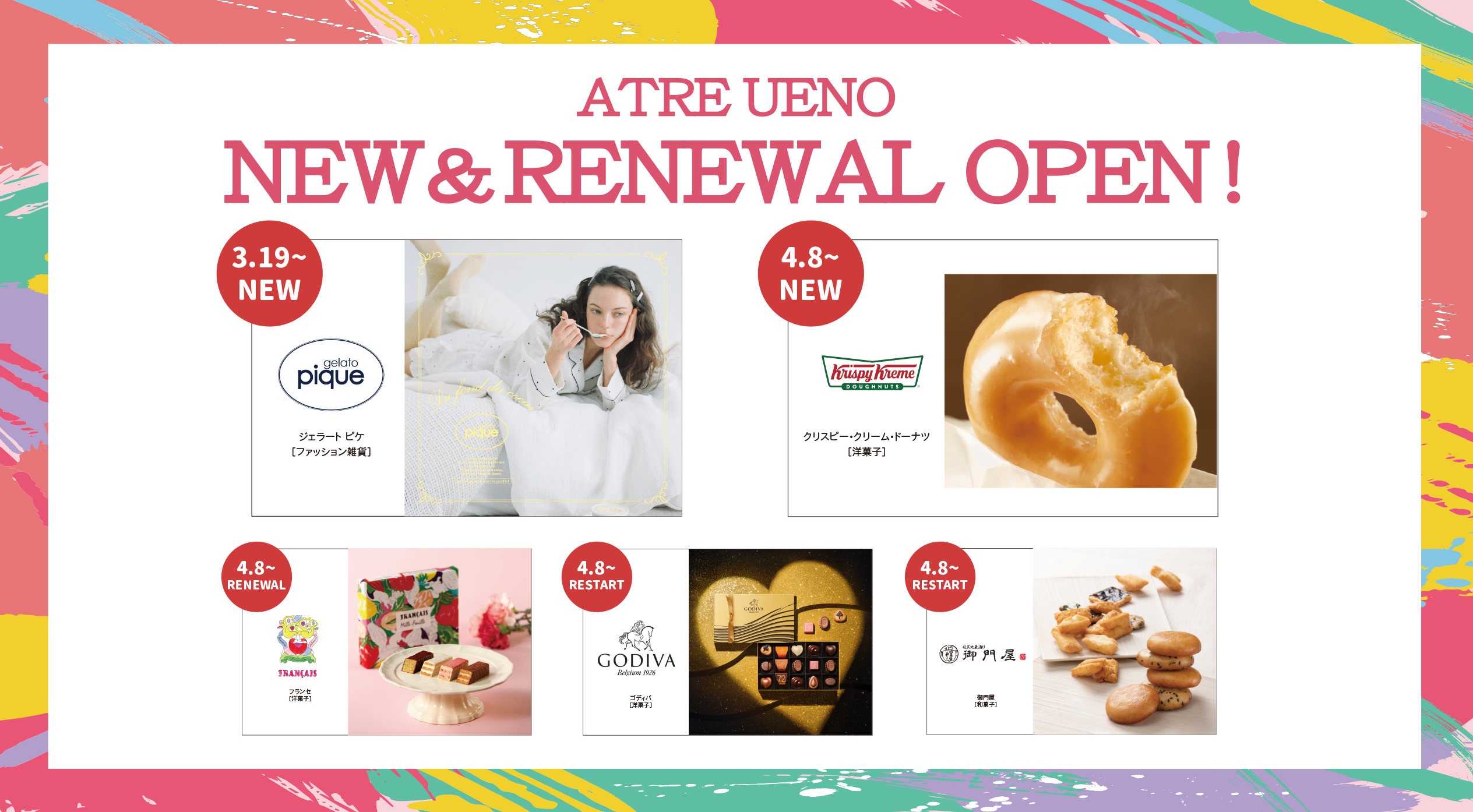 3月19日(木)には、上野エリア初出店となる「ジェラート ピケ」がニューオープン。続く4月8日(水)には、「クリスピー・クリーム・ドーナツ」のニューオープンのほか、装いも新たにリニューアルするショップや、工事に伴い一時休止していた人気スイーツショップも営業を再開し、全4ショップが一斉にオープンします。また、各ショップでは、オープンを記念した限定アイテムの販売やノベルティプレゼント等のキャンペーンを実施いたします。