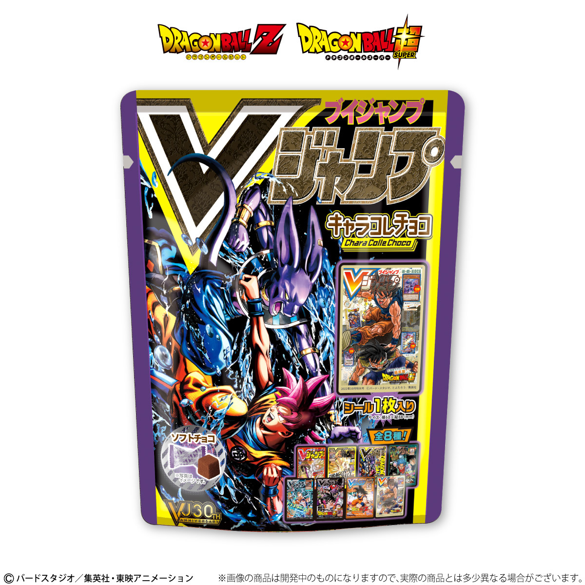 集英社から発刊されているVジャンプ創刊30周年を記念して、30年の歴史を表す表紙を、ほぼそのまま商品パッケージに使用した、通常商品ではあまり見られないデザインの商品です。第一弾はハロウィン催事商品として『ドラゴンボール』と『ワンピース』のスタンドパック入りチョコ商品を展開。中にはおまけシール全8種のうち1種と、小分けにされたチョコレートもタップリと10個入っています。