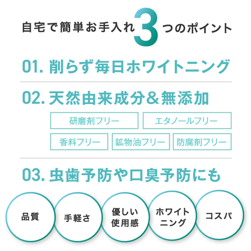 歯と同成分、ヒドロキシアパタイト(清掃剤)を独自処方でパウダーに高配合。細かい粒子が歯の隅々まで入り込み歯垢を除去。気になる口臭予防にも。