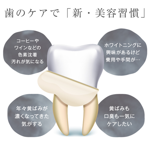 私たちが毎日行っている習慣の一つ、歯磨き。この歯磨きの多くが研磨剤でのブラッシングにより歯の表面のエナメル質が傷つきやすく、細かな傷にコーヒーやお茶などのステインが入り込み着色の原因になるということに着目し、ブラッシングすることで歯を削らず吸着して落とす歯磨きパウダーを開発しました。